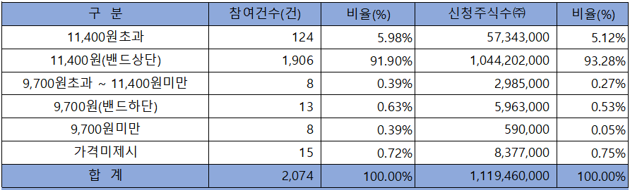 수요예측 참여 건수는 총 2,074건에 신청 주식수 1,119,460,000주로, 참여 경쟁률 1,148.16 : 1의 실적을 기록했습니다.