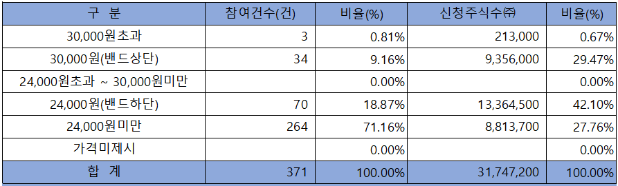 희망 공모가격 상단 이상 신청 비율은 30.14%에 불과했으며, 희망 공모가 하잔 미만 신청 비융ㄹ도 27.76%에 달했습니다.