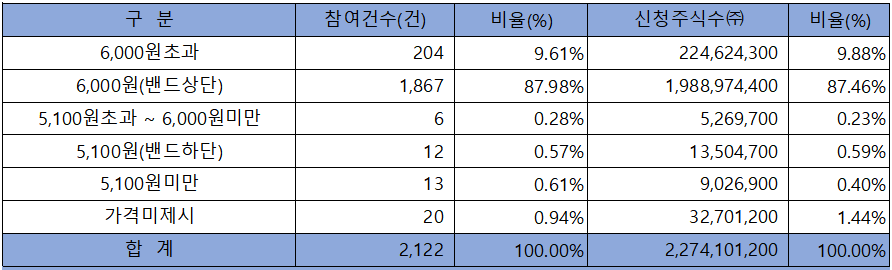 수요예측 참여 건수는 총 2,122건에 신청 주식수 2,274,101,200주로, 참여 경쟁률 1,075.52 : 1의 실적을 기록했습니다.