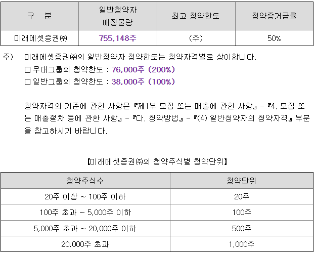 미래에셋증권의 일반 청약자 배정 물량은 755,148주이고, 일반 청약자의 최고 청약 한도는 일반그룹 기준 38,000주입니다.