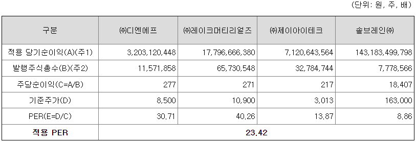 회사의 주당 평가가액은 2024년 3분기말 기준 직전 12개월의 순이익을 주식 수로 나누어 주당 순이익을 구하고, 여기에 유사회사의 PER배수를 곱하여 산출한 것입니다.