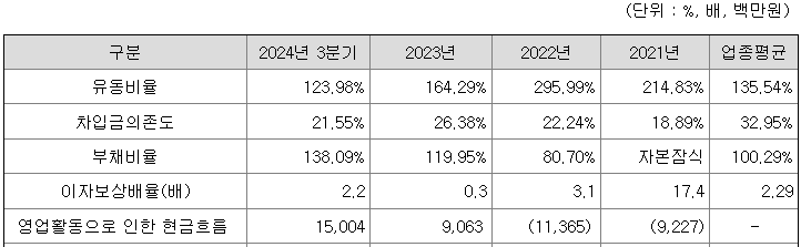 동사의 부채비율은 2023년 119.95% 2024년 3분기 138.09%로 2023년 업종평균인 100.29%보다 열위에 있으며 차입금의존도는 2024년 3분기 21.55%로 업종평균인 32.95%보다 우위에 있습니다. 회사의 차입금 규모는 2021년 이후 2023년까지 금융권 차입을 통해 CapEx 자금을 조달함에 따라 2021년 약 9,556백만원에서 2023년 32,316백만원으로 크게 증가하였으며, 이에 따라 차입금 의존도 또한 2021년 18.89%, 2022년 22.24%, 2023년 26.38%로 지속 증가하는 추세를 보였습니다. 그러나 2024년 당사가 보유한 장기차입상품의 만기가 도래하여 일부 상환함에 따라 장기차입금이 감소하는 모습을 보이고 있습니다.