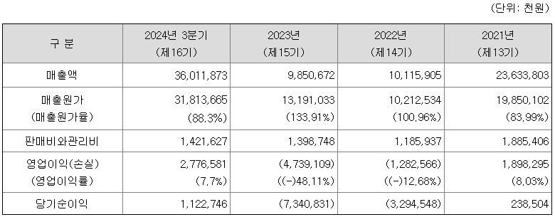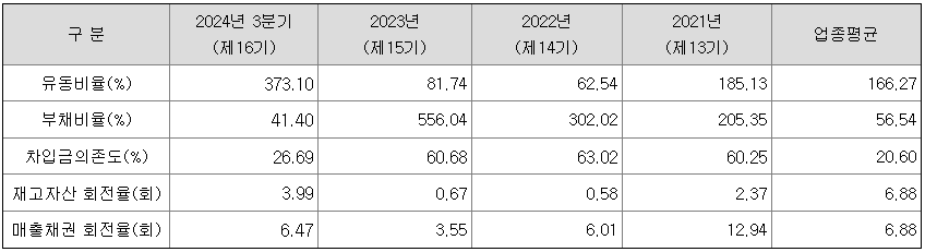 동사의 부채비율은 2021년 205.35%에서 2023년도 556.04%로 증가하였는데, 주 업종 변경 및 반도체 업황의 난조로 매출액이 급감하는 동시에 재고자산평가손실까지 더해지며 자기 자본이 감소하였기 때문입니다. 2024년부터 업황이 개선되면서 매출액이 증가하였고, 재고자산평가 차익이 발생하며 부채비율은 2024년도 3분기 기준 41.40%로 개선되었습니다.