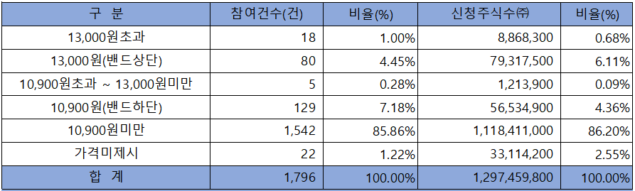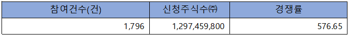 수요예측 참여 건수는 총 1,796건에 신청 주식수 1,297,459,800주로, 참여 경쟁률 576.65 : 1의 실적을 기록했습니다.