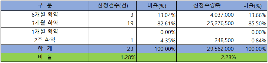 의무 보유 확약 건수는 23 건에 29,562,000주로 전체 신청 물량 대비 건수로는 1.28%, 수량으로는 2.28%였으나, 신청 수량이 적어 큰 의미가 없다고 하겠습니다.