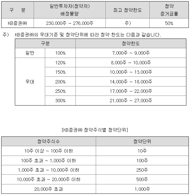 KB증권의 일반 청약자 배정 물량은 230,000주 ~ 276,000 주이고, 일반 청약자의 최고 청약 한도는 7,000주 ~ 9,000주입니다.