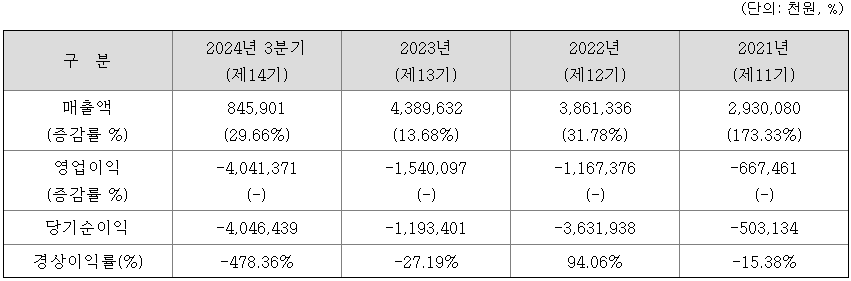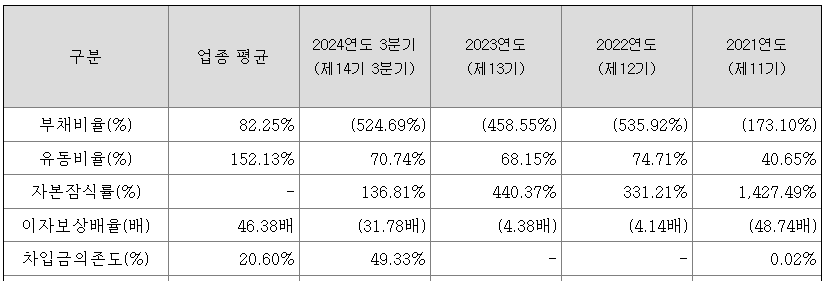 동사의 부채비율은 2021년부터 2024년 3분기까지 173.10%, 535.92%, 458.55%, 524.69%로 2024년 중 기 발행된 종류주식이 전량 보통주로 전환됨에 따라 재무 건전성이 일부 개선되었지만 2024년 기준 운영자금 등 충당 목적 차입 및 누적된 결손금으로 인한 음(-)의 자본총계로 음(-)의 부채비율을 나타내고 있으며, 그 수준은 업종 평균인 82.25% 대비 열위한 것으로 나타납니다.