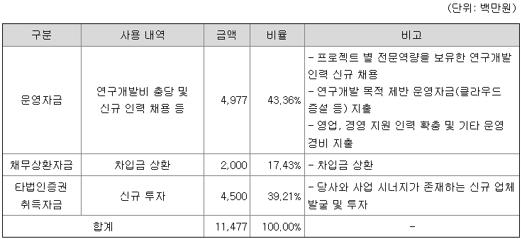 심플랫폼은 금번 공모를 통해 조달된 자금으로 타법인증권 취득 자금으로 45억, 채무상환에 20억을 사용하고, 나머지 50억을 운영자금으로 사용할 계획입니다.