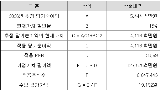 회사의 주당 평가가액은 2026년 추정 순이익을 할인하여 현재가치로 환산한 후, 유사회사의 평균PER배수를 곱하여 회사가치를 정하고, 이를 주식 수로 나누어 산출한 것입니다.