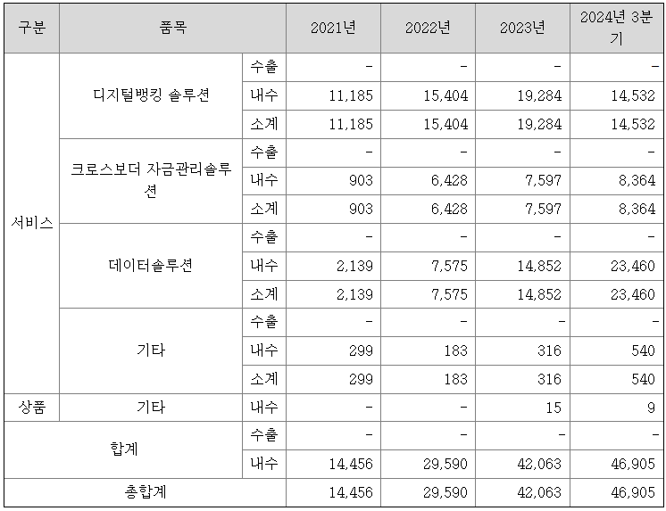 크로스보더 자금관리 솔루션의 주요 서비스는 크로스보더 거래를 취급하는 국내외 고객사의 환전 및 정산 업무 자동화를 위한 외화정산 서비스입니다. 당사는 플랫폼 내에서 한국(외국) 판매자와 외국(한국) 구매자 사이에 발생한 거래 등 다국적 거래로 인해 발생하는 통화 환전 및 정산 업무를 효율화하기 위해 글로벌 플랫폼을 대상으로 환전 및 정산 서비스를 제공하고 있습니다.