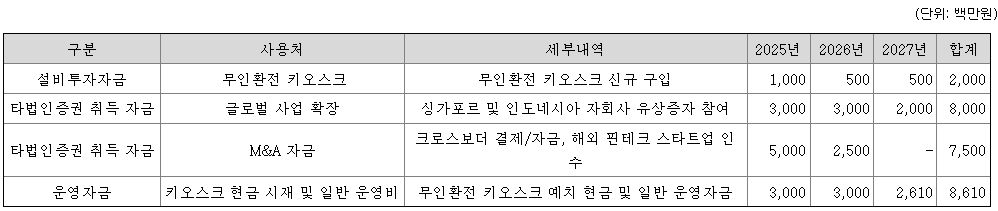 동사는 신규 사업으로 해외 여행객을 대상으로 무인환전, 선불카드, 및 택스리펀드 등 서비스를 제공하는 B2C 외환 서비스 사업을 신규사업으로 확장하고 있습니다. 동사는 현재 주요 관광지, 호텔 등을 중심으로 설치한 무인환전 키오스크를 활용 하여 외국인 관광객 대상 환전 서비스를 제공하고 있고, 향후 선불카드, 부과세 환급(Tax Refunds) 등 부가적인 금융 서비스를 추가하여 외국인 관광객 대상 금융 서비스 시장을 공략 계획 중입니다. 이러한 B2C 외환 서비스 사업의 경쟁력 강화를 위해 동사는 금번 공모 자금을 활용하여 무인 환전 키오스크 설비를 추가적으로 설치할 계획입니다. 또한 무인환전 키오스크에 환전 목적으로 보관하는 현금 시재 또한 금번 공모자금으로 확보할 계획입니다.