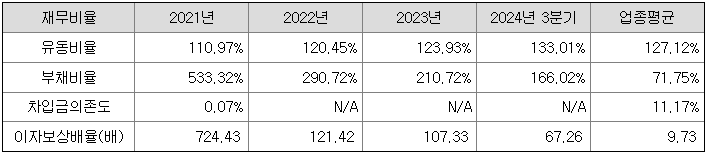 동사의 부채비율은 2021년 533.32%, 2022년 290.72%, 2023년 210.72%, 2024년 3분기 166.02%로 견고한 회사 성장을 통해 2021년 이후 지속적으로 부채비율을 개선하고 있습니다. 동사는 차입금은 해당사항이 없으나 영업활동으로 인한 거래에 따라 고객 예수금을 수취하고 있으며, 동 금액이 부채로 계상됨에 따라 부채비율이 높게 나타나는 경향이 있습니다. 다만, 동사는 2021년 이후 지속적으로 당기순이익을 시현하고 있으며, 자기 자본의 증가로 부채비율은 2021년 533.32%에서 2024년 3분기 166.02%로 감소하였습니다.