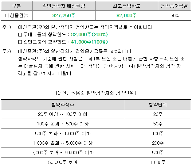 대신증권의 일반 청약자 배정 물량은 827,250주이고, 일반 청약자의 최고 청약 한도는 일반그룹 기준 41,000주입니다.