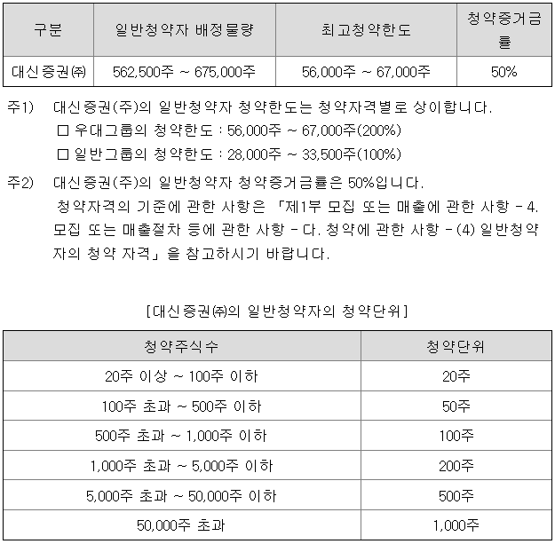 대신증권의 일반 청약자 배정 물량은 562,500주 ~ 675,000주이고, 일반 청약자의 최고 청약 한도는 일반그룹 기준 28,000주 ~ 33,500주입니다.