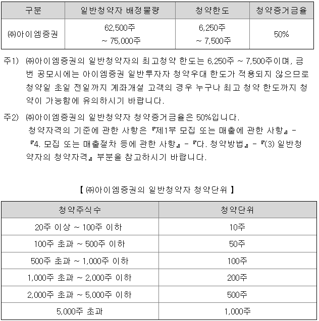 IM증권의 일반 청약자 배정 물량은 62,500주 ~ 75,000주이고, 일반 청약자의 최고 청약 한도는 AHEMS RHROR 모든 고객 동일하게 6,250주 ~ 7,500주입니다.