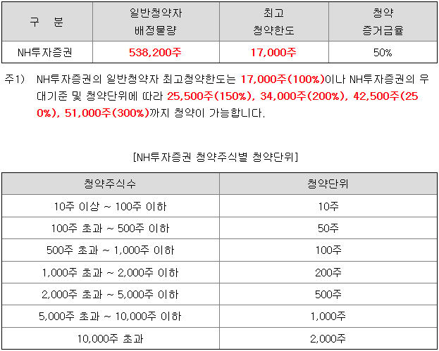- 청약 가능 증권사 : NH투자증권, 신한투자증권, 유진투자증권