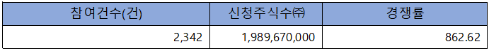 수요예측 참여 건수는 총 2,342건에 신청 주식수 1,989,670,000주로, 참여 경쟁률 862.62 : 1의 실적을 기록했습니다.