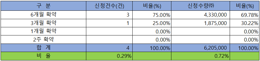 의무 보유 확약 건수는 4건에 6,205,000주로 전체 신청 물량 대비 건수로는 0.29%, 수량으로는 0.72%였으나, 신청 수량이 적어 큰 의미가 없다고 하겠습니다.