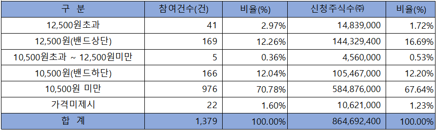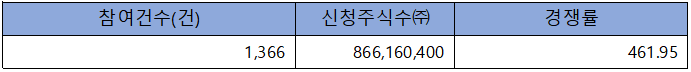 수요예측 참여 건수는 총 1,366건에 신청 주식수 866,160,400주로, 참여 경쟁률 461.95 : 1의 실적을 기록했습니다.