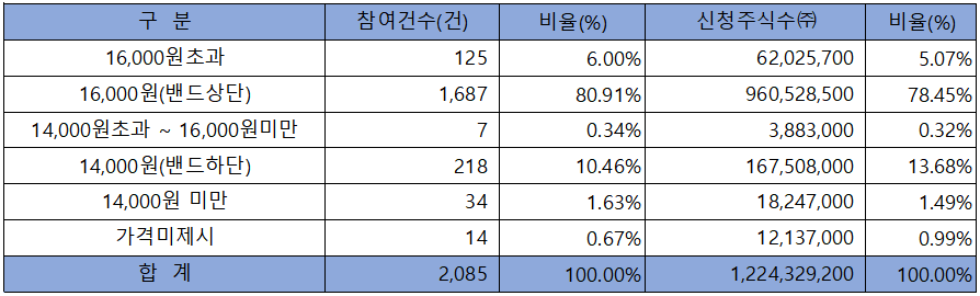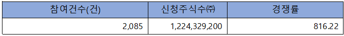 수요예측 참여 건수는 총 2,085건에 신청 주식수 1,224,329,200주로, 참여 경쟁률 816.22 : 1의 실적을 기록했습니다.