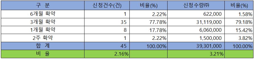 의무 보유 확약 건수는 45건에 39,031,000주로 전체 신청 물량 대비 건수로는 2.16%, 수량으로는 3.21%였으며, 3개월 이상 확약 비중이 제일 높았습니다.