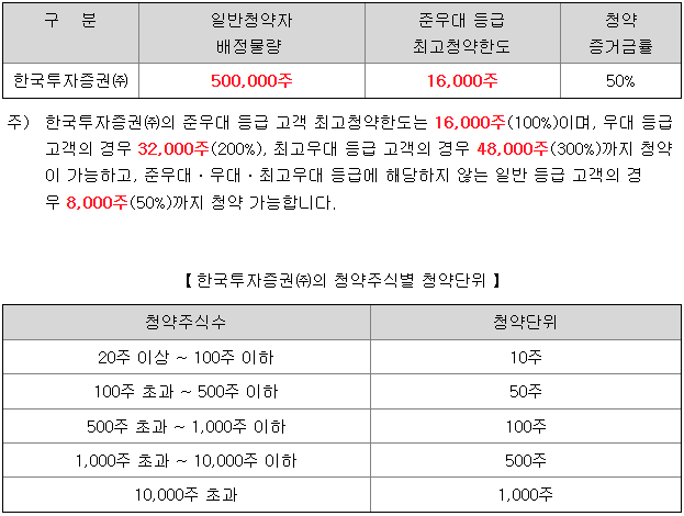 한국투자증권의 일반 청약자 배정 물량은 500,000주이고, 일반 청약자의 최고 청약 한도는 일반 등급 고객 기준 8,000주입니다.