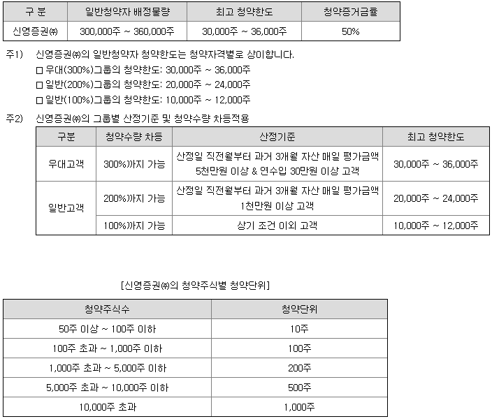 신영 증권의 일반 청약자 배정 물량은 300,000주 ~ 360,000주이고, 일반 청약자의 최고 청약 한도는 일반고객 기준 10,000주 ~ 12,000주입니다.