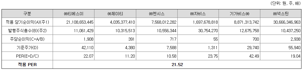 <유사회사의 평균 PER 배수 산정>