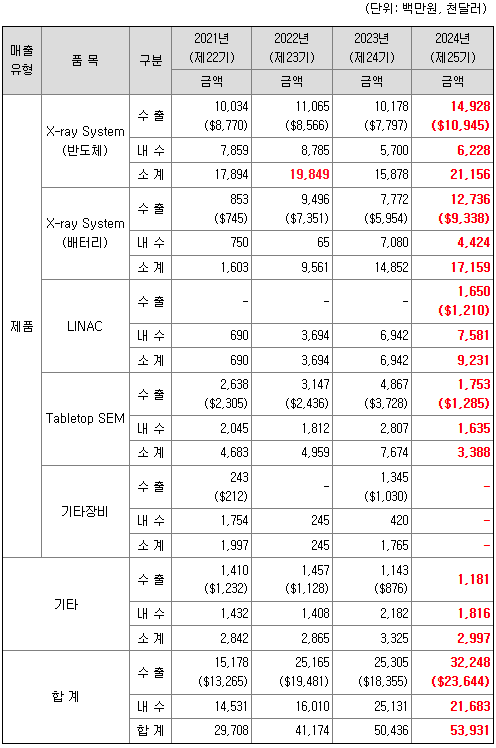 동사의 검사장비는 크게 1) 반도체 및 배터리 산업용 X-ray System, 2) 방산 산업용 LINAC(선형가속기) System, 3) 연구, 분석용 Tabletop SEM(탁상형 주사전자현미경)으로 구분되어 사용되고 있습니다.