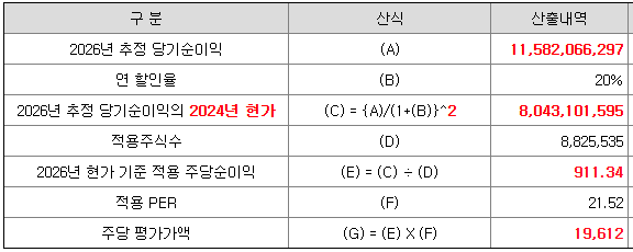 회사의 주당 평가가액은 2026년 추정 순이익을 할인하여 현재가치로 환산한 후, 주식 수로 나누어 주당 순이익을 구하고, 여기에 유사회사의 평균 PER배수를 곱하여 산출한 것입니다