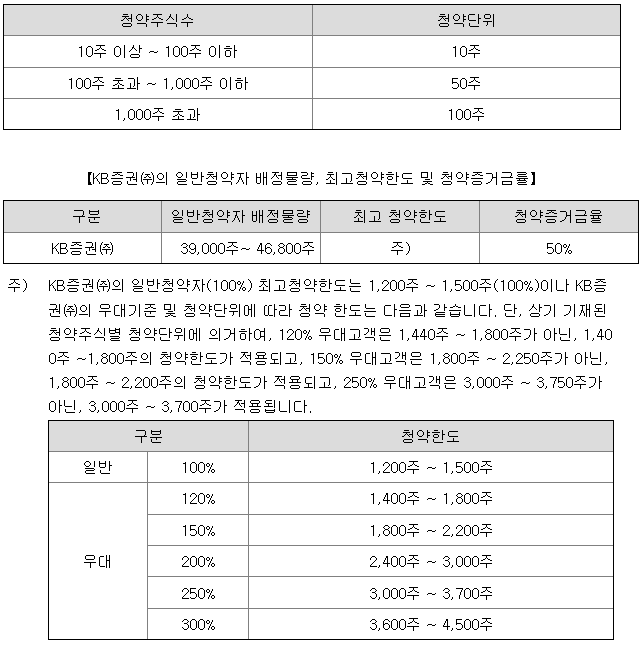KB증권의 일반 청약자 배정 물량은 39,000주 ~ 46,800주이고, 일반 청약자의 최고 청약 한도는 일반 고객 기준 1,200주 ~ 1,500주입니다.