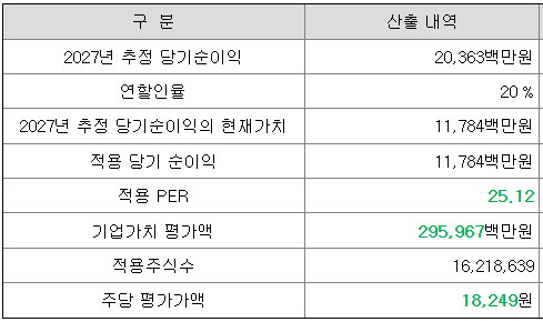 회사의 주당 평가가액은 2027년 추정 순익익을 할인하여 현재가치로 환산한 후, 유사회사의 평균 PER배수를 곱하여 회사가치를 정하고, 이를 주식수로 나누어 산출한 것입니다.