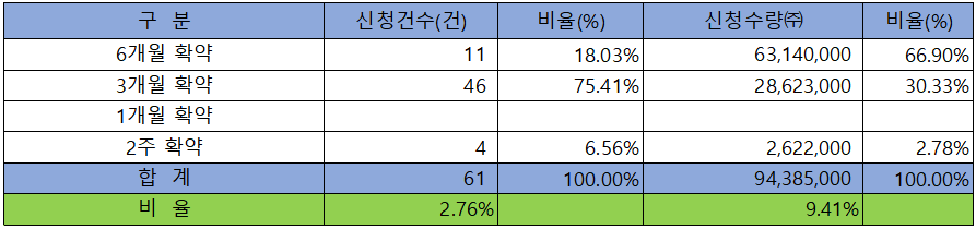 의무 보유 확약 건수는 61건에 94,385,000주로 전체 신청 물량 대비 건수로는 2.76%, 수량으로는 9.41%였으며, 3개월 확약 비중이 제일 높았습니다.