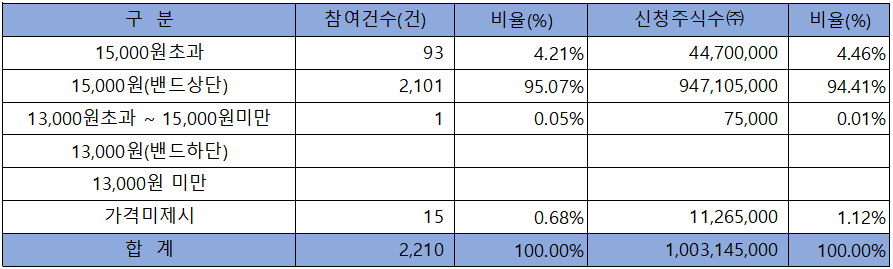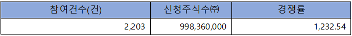 수요예측 참여 건수는 총 2,203건에 신청 주식수 998,360,000주로, 참여 경쟁률 1,232.54 : 1의 실적을 기록했습니다.