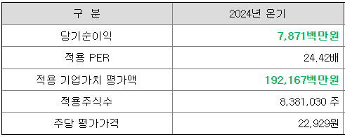 회사의 주당 평가가액은 2024년 연간 순이익에 유사회사의 평균 PER 배수를 곱하여 회사가치를 정하고, 이를 주식 수로 나누어 산출한 것입니다.