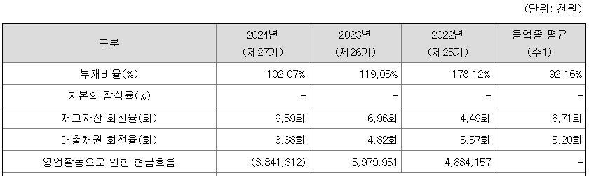 동사의 부채비율은 2022년 178.12%에서 매년 꾸준히 감소하여 2024년 기준 102.07% 수준으로 하락하였습니다.
