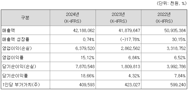 2024년은 매출원가율이 가장 낮은 수소저장합금의 매출 비중이 전체 매출액의 32.84%였고, 원재료 가격 하락에 따른 SCV 원가 개선(원가율 2023년 77.51% → 2024년 62.12%), 가스히터 등 기타 제품군 중 가장 마진이 좋은 Recondenser 매출 비중 상승에 따른 가스히터 등 기타 제품군 전체의 원가율(2023년 114.83% → 2024년 86.31%) 개선으로 인하여 2023년 보다 수익성이 개선되었습니다.