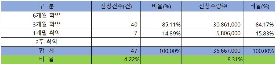 의무 보유 확약 건수는 47건에 36,667,000주로 전체 신청 물량 대비 건수로는 4.22%, 수량으로는 8.32%였으며, 3개월 확약 비중이 제일 높았습니다.