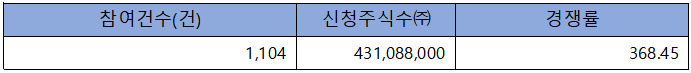 수요예측 참여 건수는 총 1,104건에 신청 주식수 431,088,000주로, 참여 경쟁률 368.45 : 1의 실적을 기록했습니다.
