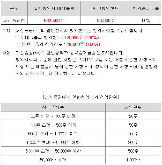 대신증권의 일반 청약자 배정 물량은 562,500주이고, 일반 청약자의 최고 청약 한도는 일반 그룹 기준 28,000주입니다.