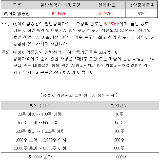 IM증권의 일반 청약자 배정 물량은 62,500주이고, 일반 청약자의 최고 청약 한도는 모든 고객 공히 6,250주입니다.