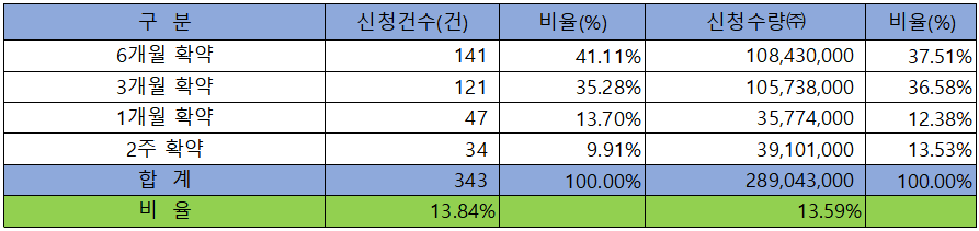 의무 보유 확약 건수는 343건에 289,043,000주로 전체 신청 물량 대비 건수로는 13.84%, 수량으로는 13.59%였으며, 6개월 확약 비중과 3개월 확약 비중이 1,2위를 다투고 있습니다.