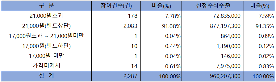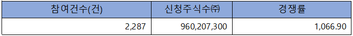 수요예측 참여 건수는 총 2,287건에 신청 주식수 960,207,300주로, 참여 경쟁률 1,066.90 : 1의 실적을 기록했습니다.