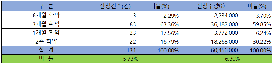의무 보유 확약 건수는 131건에 60,456,000주로 전체 신청 물량 대비 건수로는 5.73%, 수량으로는 6.30%였으며, 3개월 확약 비중이 제일 높았습니다.