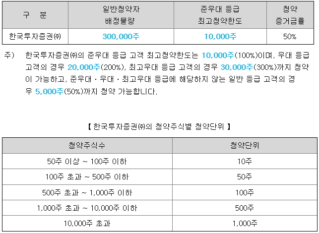 한국투자증권의 일반 청약자 배정 물량은 300,000주이고, 일반 청약자의 최고 청약 한도는 일반 등급 기준 5,000 주입니다.