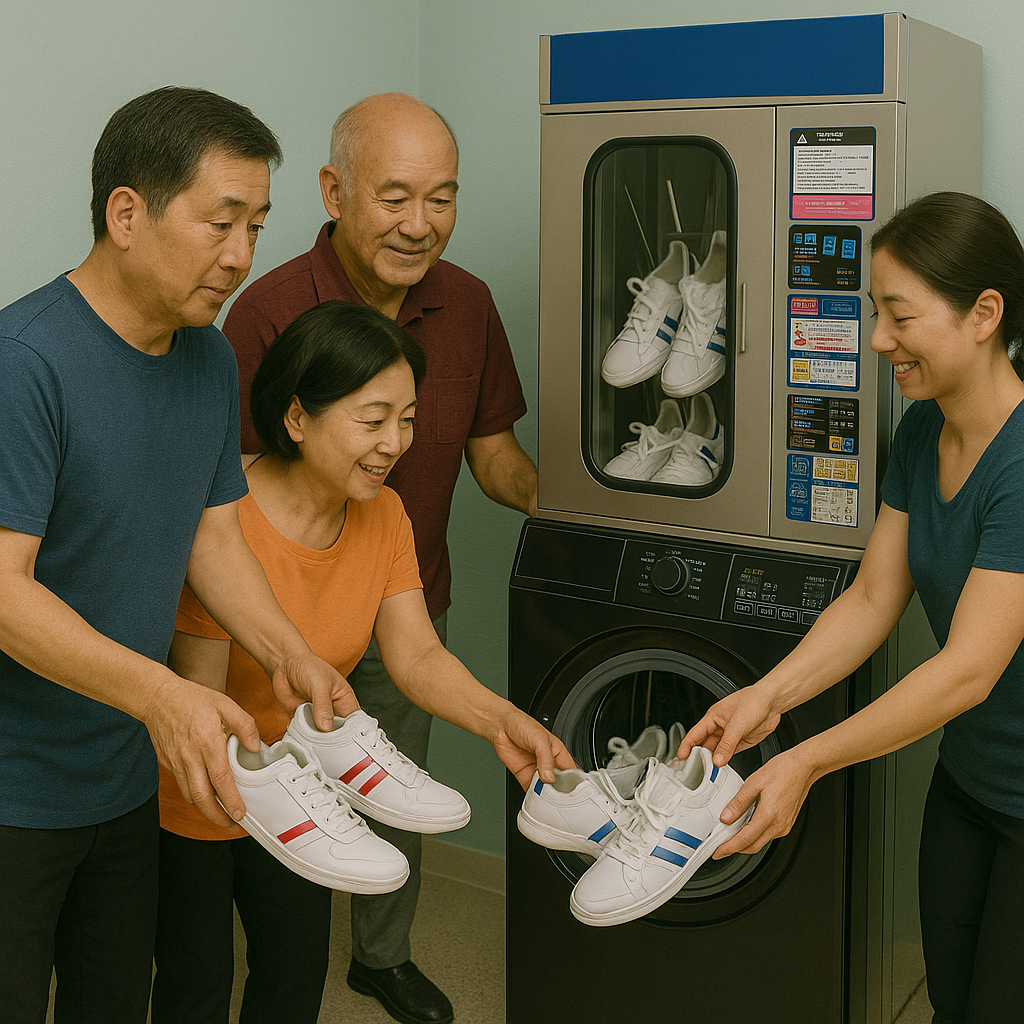 그런데 운동화 전용 세탁기가 운동화 6켤레 세탁에서 건조까지 1만 2천원이라는 소식에 누군가 탁구화 세탁을 하자고 제안하였고, 순식간에 6켤레가 모였습니다.
