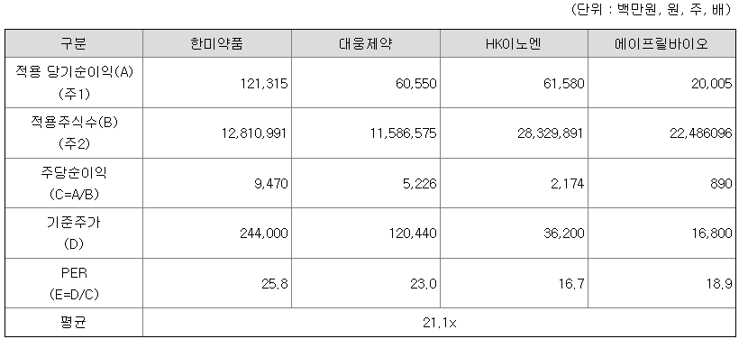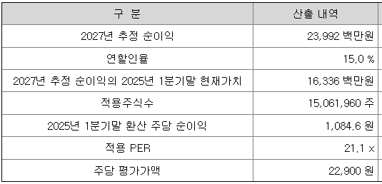 회사의 주당 평가가액은 2027년 추정 순이익을 할인하여 현재가치로 환산 한 후, 주식 수로 나누어 주당 순이익을 구하고, 여기에 유사회사의 평균 PER 배수를 곱하여 산출한 것입니다.