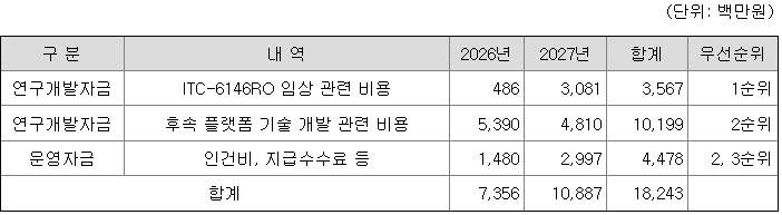 인투셀은 금번 공모를 통해 조달된 자금으로 연구개발비에 137억을 사용하고, 나머지 45억을 운영자금으로 사용할 계획입니다.