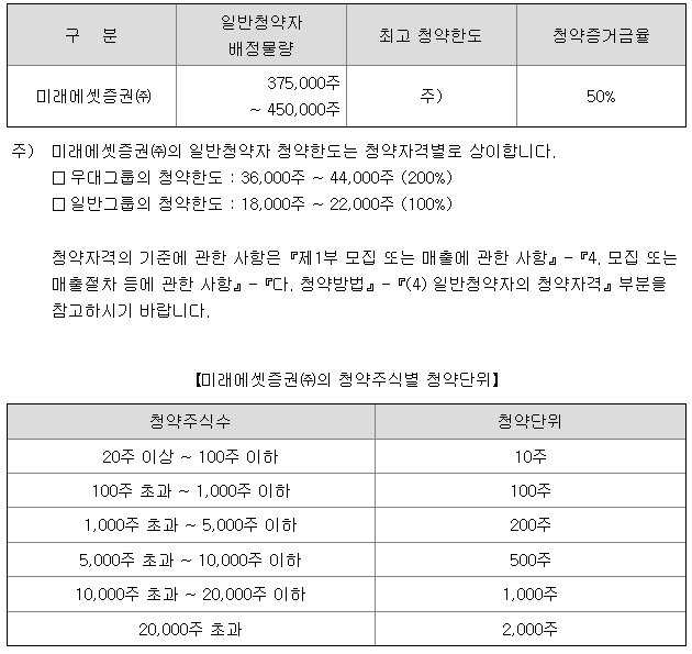 미래엣증권의 일반 청약자 배정 물량은 375,000주 ~ 450,000주이고, 일반 청약자의 최고 청약 한도는 일바그룹 기준 18,000주 ~ 22,000주입니다.