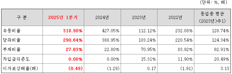 지씨지놈의 2022년 및 2023년 부채비율은 각 83.9%, 71.0%로 동업종 평균인 62.91%보다 다소 높은 수준이었으나, 2024년 22.8%로 크게 개선되었습니다. 또한, 2025년 1분기 27.63% 수준을 유지하고 있습니다. 이는 당사가 2020년 12월 발행한 200억원 규모의 전환사채가 2022년 및 2024년 2차례에 거쳐 전량 보통주로 전환된 것에 기인합니다. 또한 차입금의존도는 전환사채 전량 보통주 전환되면서 2024년 0.00%를 기록하고 있습니다.